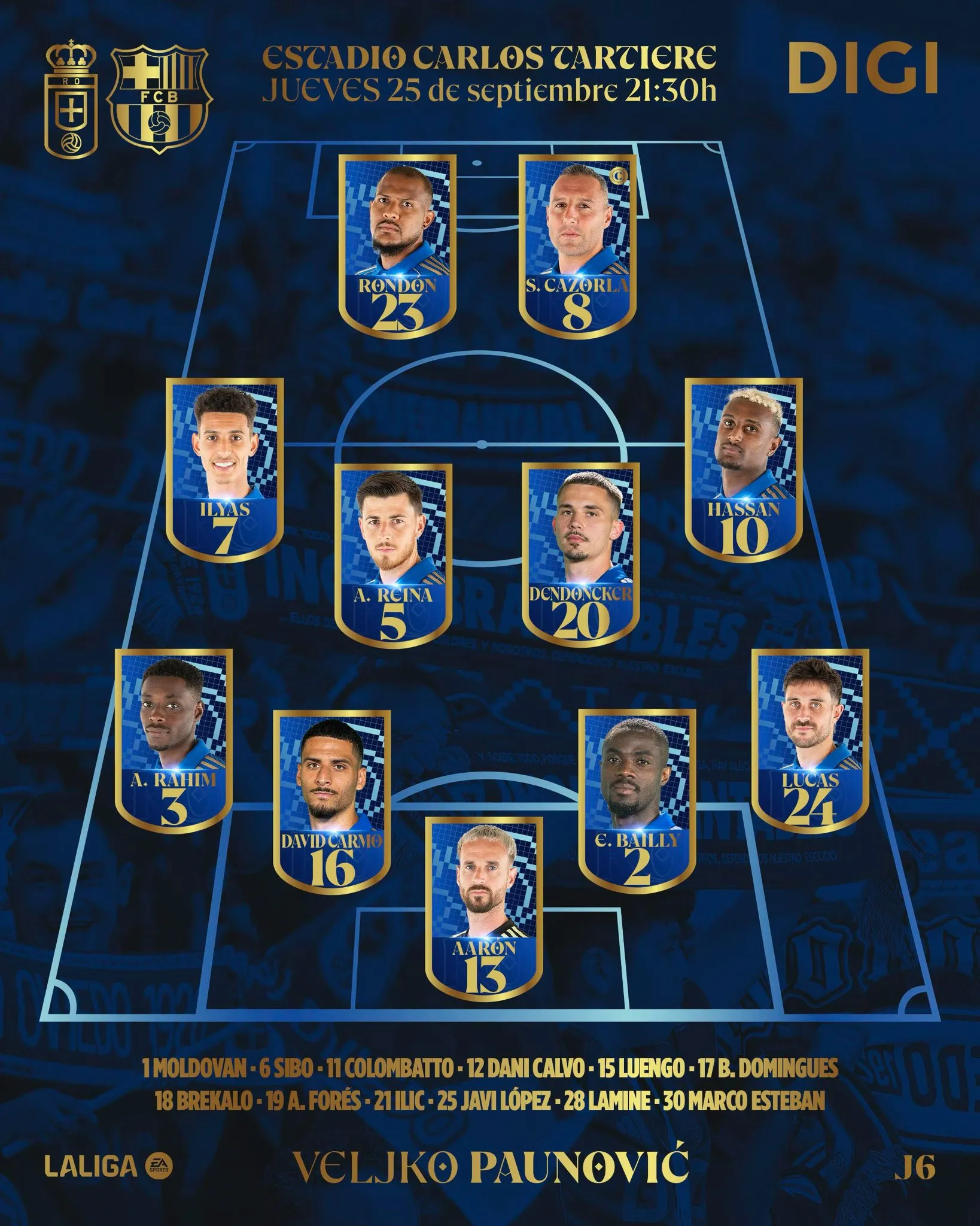 奥维耶多替补:1-摩尔多万/12-卡尔沃、15-奥耶尔、25-哈维-洛佩斯、30-埃斯特万/6-西波、11-哥伦巴托、17-多明格斯、21-伊利奇/18-布雷卡洛、19-阿莱克斯-佛雷斯、28-盖伊